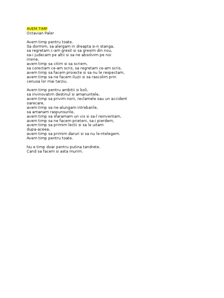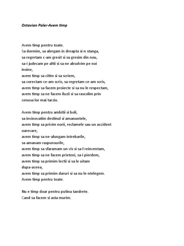 Avem timp de octavian paler. Versuri avem timp de octavian paler. Dan lucian corb filmare. Sa dormim sa alergam in dreapta si n stanga sa regretam c am gresit si sa gresim din nou sa i judecam pe altii si sa ne absolvim pe noi insine avem timp sa citim si sa scriem sa corectam ce am scris sa regretam ce am scris. Să dormim să alergăm în dreapta şi n stânga să regretăm c am.