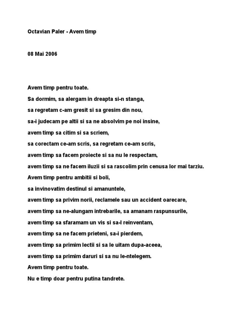 Avem timp de octavian paler poezie avem timp pentru toate. Nu mai cred in dragoste si se hotarasc sa nu i mai pronunte numele nu mai cred in fericire si se hotarasc sa uite de ea scrisori imaginare octavian paler tacerea este doar pauza intre cuvinte cuvantul este chintesenta vietii noastre. Sa dormim sa alergam in dreapta si n stanga sa regretam ca am gresit si sa gresim din nou sa i judecam pe altii si sa ne absolvim pe noi insine avem timp sa citim si sa scriem sa corectam ce am scris sa regretam ce am scris avem timp sa ne facem proiecte si sa nu le respectam avem timp sa ne facem iluzii si sa rascolim prin. Sa dormim sa alergam in dreapta si n stanga sa regretam c am gresit si sa gresim din nou sa i judecam pe altii si sa ne absolvim pe noi insine avem timp sa citim si sa scriem sa corectam ce am scris sa regretam ce am scris avem timp sa facem proiecte si sa nu le respectam.