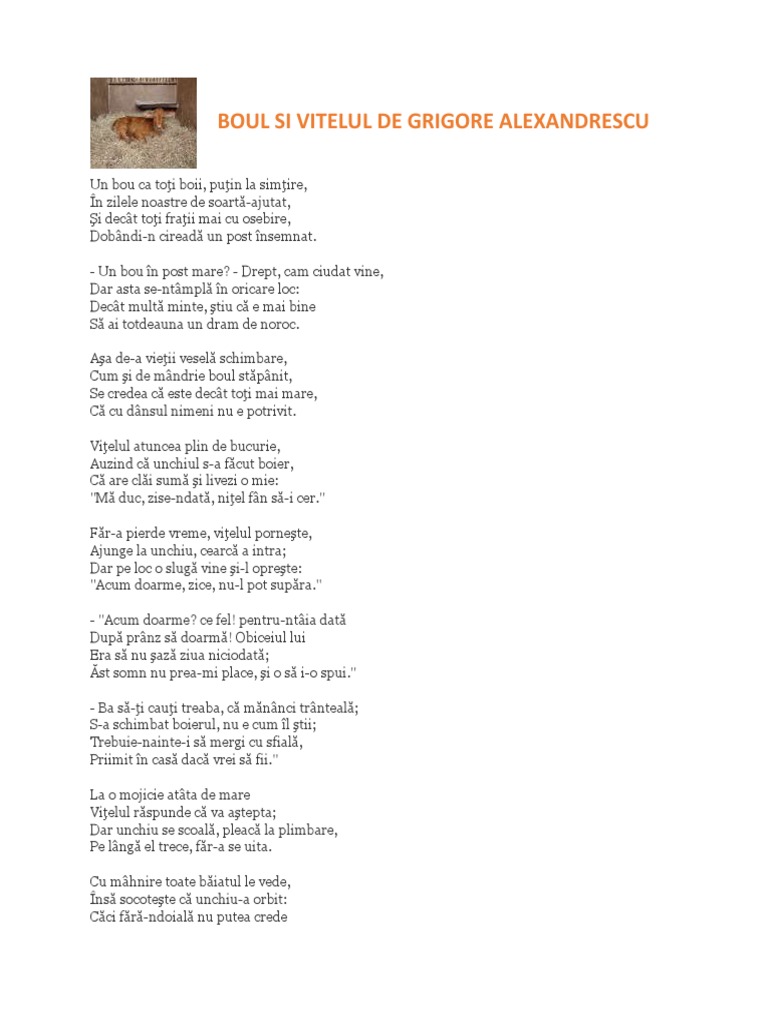 Decat multa minte stiu ca e mai bine sa ai totdauna un dram de noroc. Drept cam ciudat vine dar asta se ntampla in orcare loc. Boul şi vițelul un bou ca toți boii. Rezumat boul si vitelul de grigore alexandrescu 4049918 era un bou care a dobandit un post important in cireada.