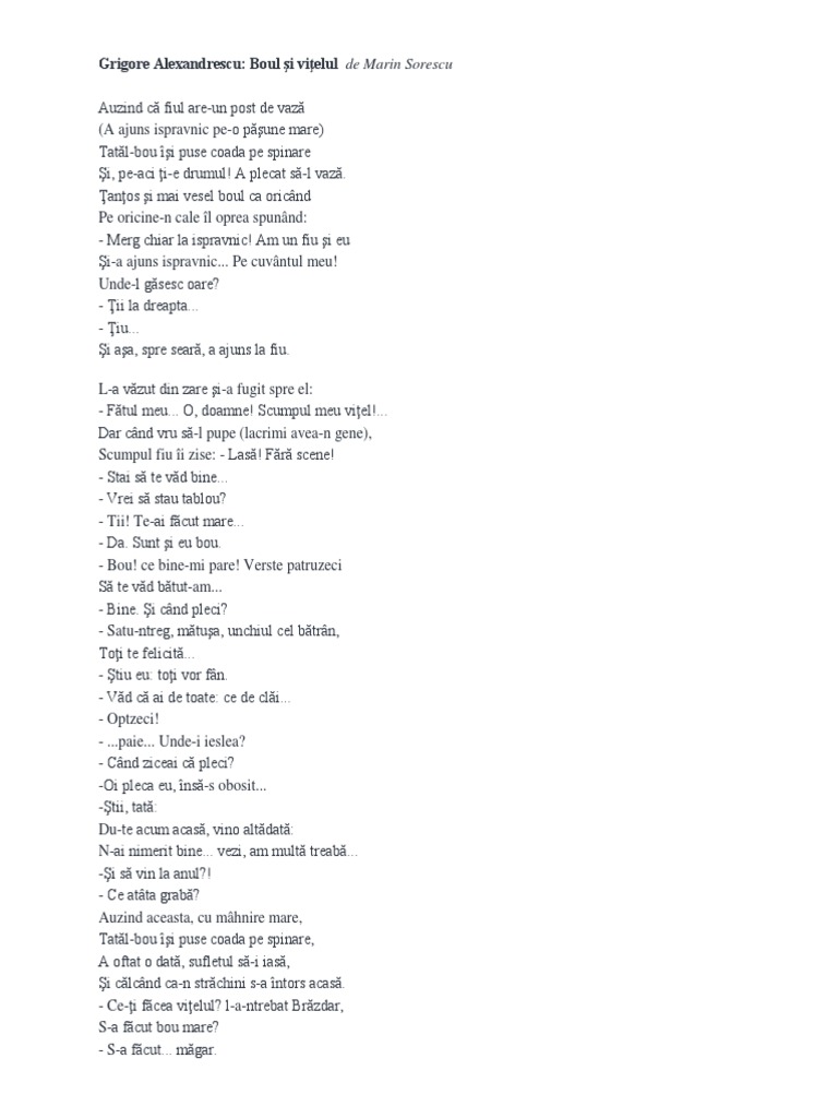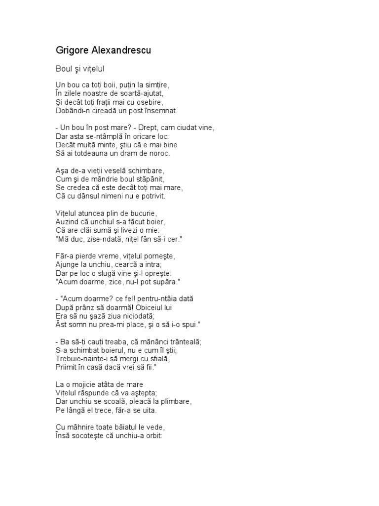 1810 02 22 se naste la targoviste ca fiu al vistierului mihai si al mariei fusea al patrulea din cei cinci copii ai familiei viitorul poet grigore alexandrescu tatal mihai alexandrescu ocupa functia de vistiernic iar mama sa maria era casnica. Boul si vitelul de grigore alexandrescu. Versuri grigore alexandrescu boul si vitelul un bou ca toti boii putin la simtire in zilele noastre de soarta ajutat si decat toti fratii mai cu osebire dobandi n cireada un post insemnat. Un bou in post mare.