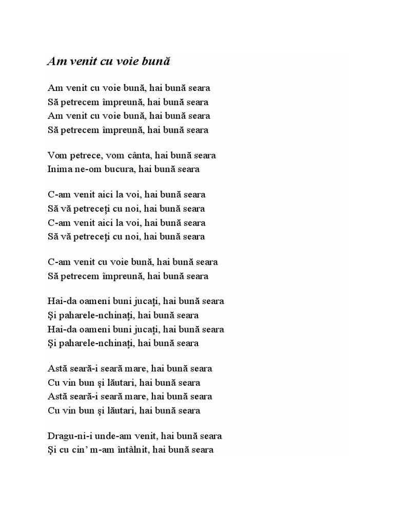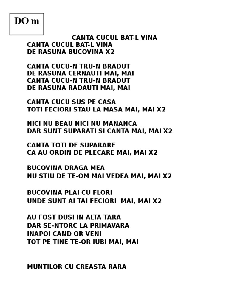 Bucovină plai cu flori unde sunt ai tăi feciori. Canta cucu bata l vina de rasuna bucovina canta cucu bata l vina de rasuna bucovina. Canta toti de suparare. Versuri canta cucu bata l vina de rasuna bucovina canta cucu bata l vina de rasuna bucovina canta cucu n tru n bradut de rasuna cernauti mai mai canta cucu n tru n bradut de rasuna radauti mai mai canta cucu sus pe casa toti feciori stau la masa mai mai nici nu beau nici nu mananca dar sunt suparati si canta mai mai canta toti de suparare ca au ordin de plecare mai mai bucovina draga mea.