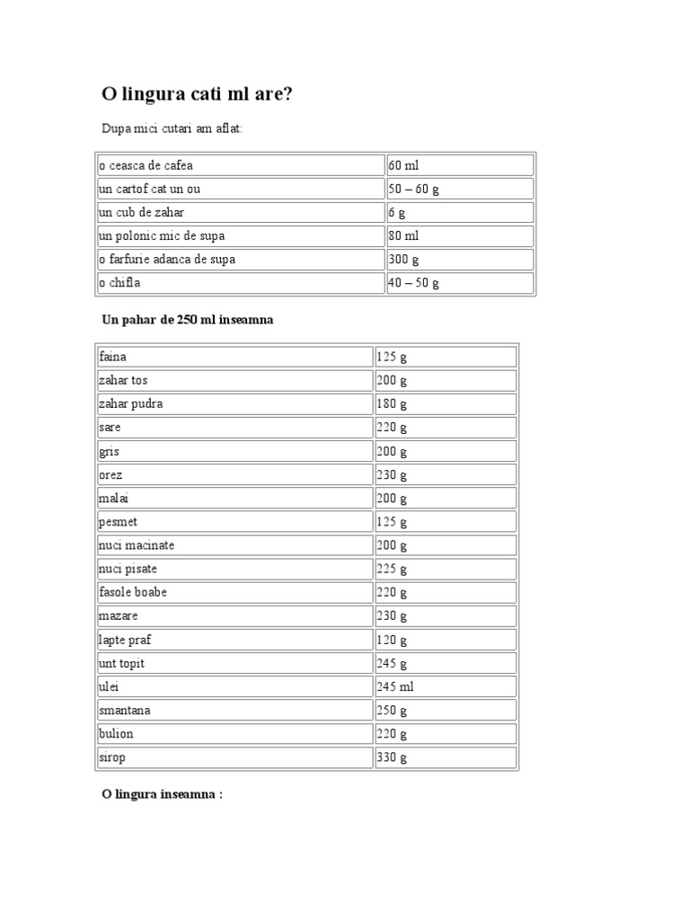 1 lingura de apa vin lapte 14 15g 1 lingura de untura unt 25g 1 lingura de orez 25g 1 lingura de zahar pudra 25g 1 lingura de zahar tos 30g 3 linguri 50 ml 1 lingura 3 lingurite. Un forum care ofera solutii pentru unele probleme legate in general de pc. Uite aici masura lingritei cu aceste produse pentru ca fiecare produs are o cantitate diferita in lingurita. Echivalenta picaturi mililitri lingurita lingura.