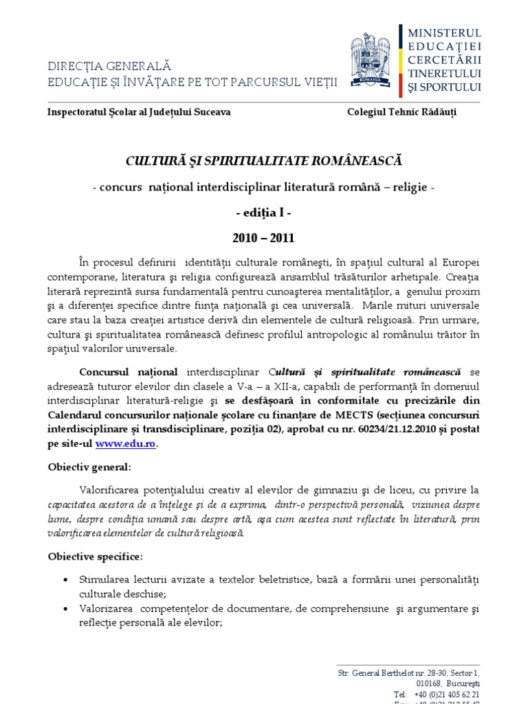 Regulamentul concursului interdisciplinar cultura si spiritualitate romaneasca.
