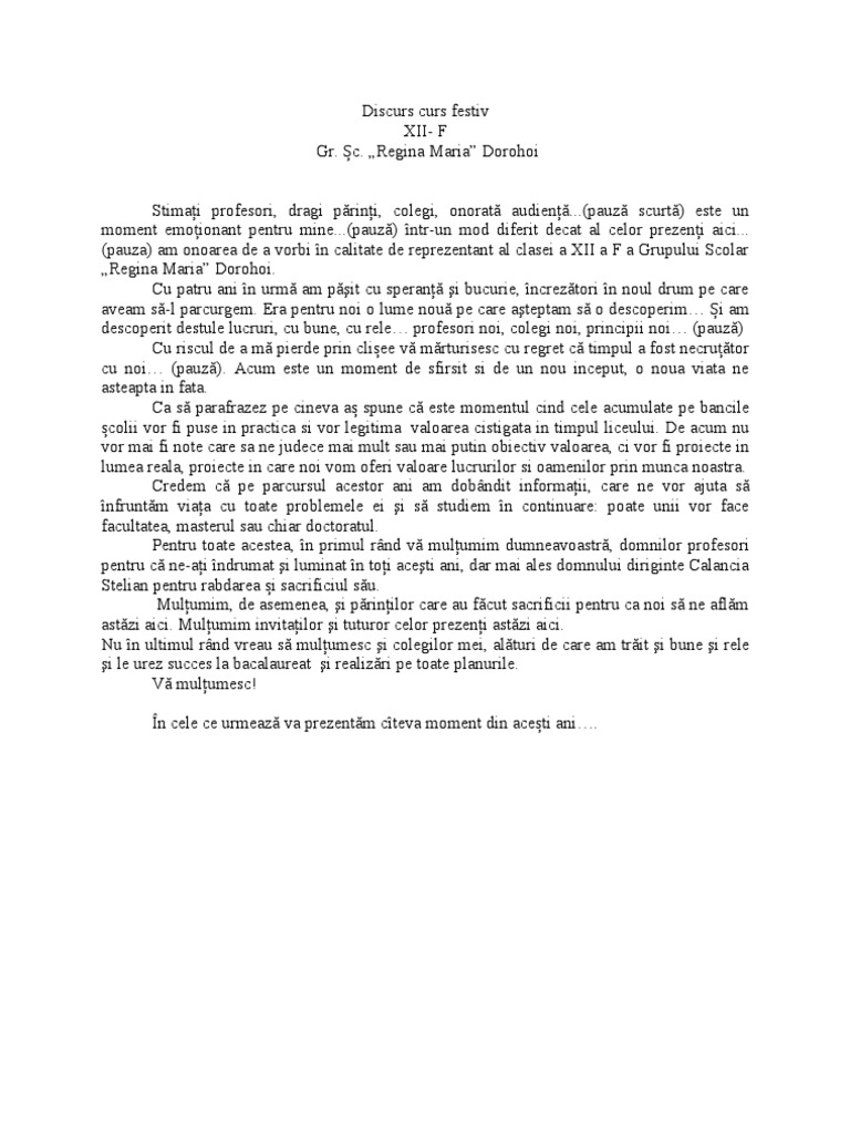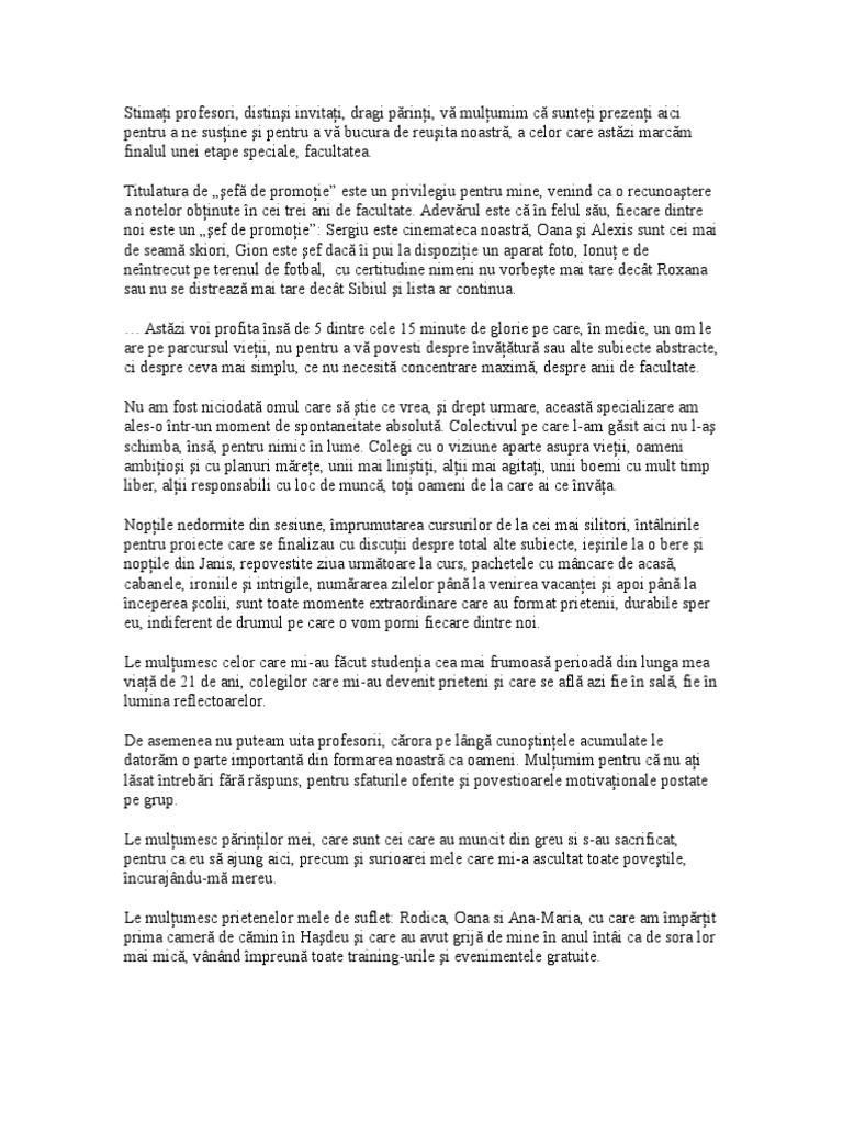 Este clipa n care ne lum rmas bun de la aceast facultate. Suntem calmi si poate putini euforici pregatiti fizic si sufleteste pentru petrecerea din aceasta seara. Dragi absolventi distinsi profesori stimati parinti si invitati sunt deosebit de onorat ca ma aflu in aceasta zi speciala aici in fata dumneavoastra in postura de decan de an. Trebuie sa fim mandri ca suntem absolventi ai facultatii de stiinte juridice si in curand licentiati in acest domeniu.