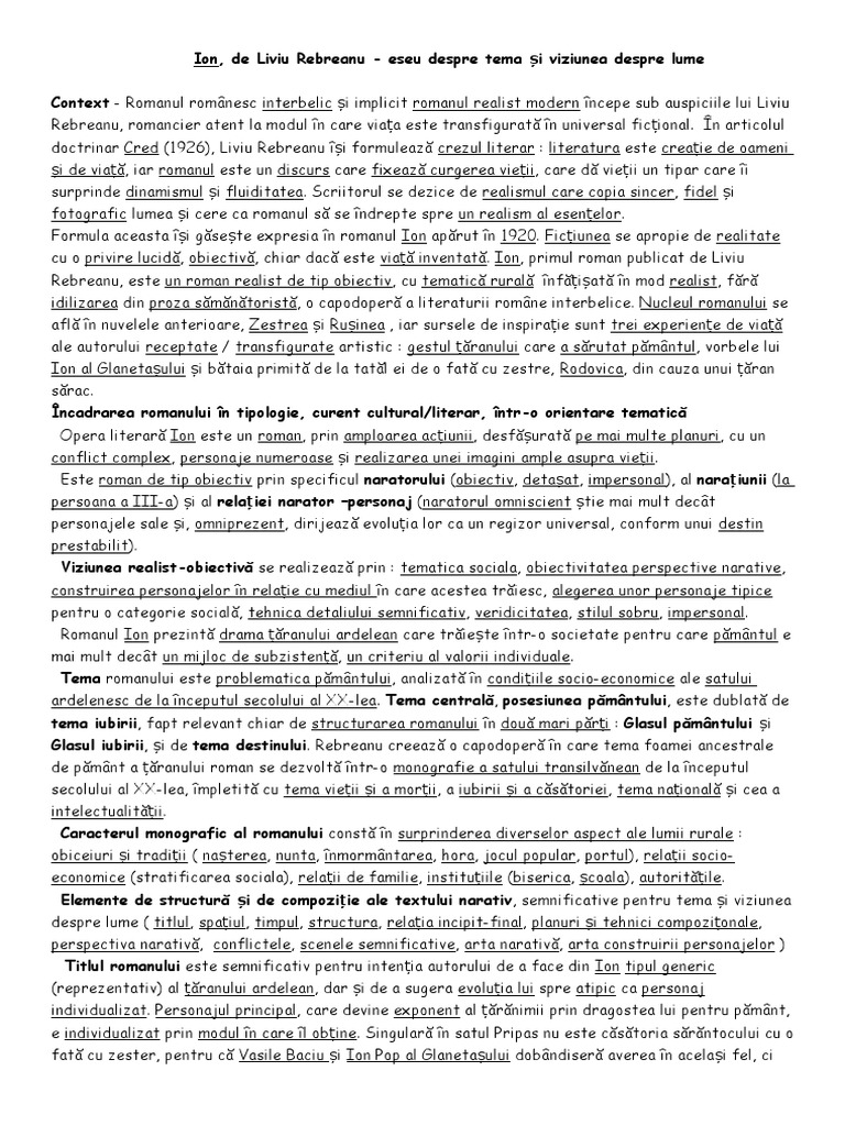 Eseu ion de liviu rebreanu. Romanul este o monografie a realită ț ilor satului ardelean de la începutul sec. El îşi găseşte expresia şi în romanul ion al lui liviu rebreanu a cărui apariţie în anul 1920 rezolvă o problemă şi curmă o controversă e. Tema și viziunea despre lume. Gândit îndelung și redactat pe durata a patru ani de zile romanul ion a apărut în 1920 fiind bine primit și ulterior considerat drept o capodoperă a genului și primul roman românesc într adevăr desăvârșit.