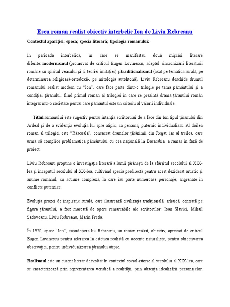 Ion de liviu rebreanu eseu. Lovinescu deoarece prin obiectivitatea observaţiei şi prin aderarea la o estetică de tip naturalist. Liviu rebreanu a pornit în scrierea acestui roman de la fapte reale pe care le a transfigurat în opera sa. Opera lui liviu rebreanu este o proza realist obiectiva care propune o viziune traditionala fiind vizibile si elemente de modernitate.