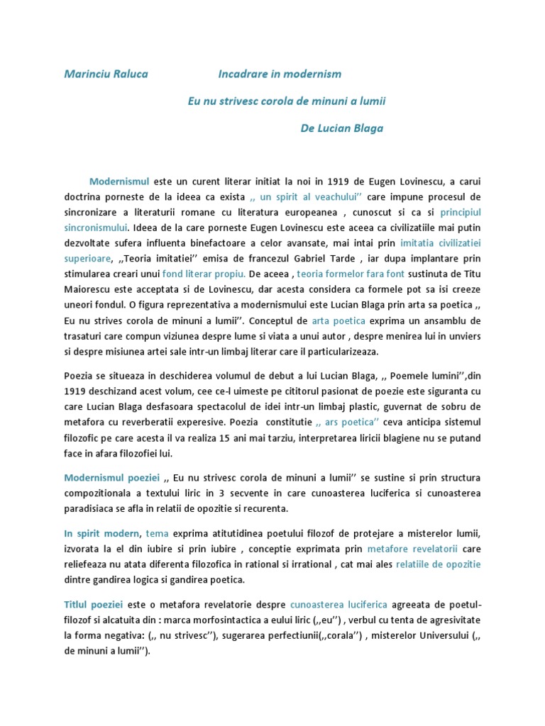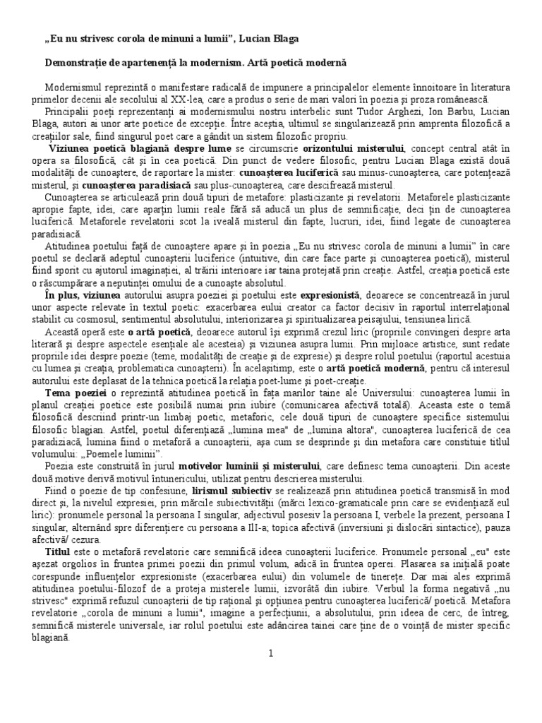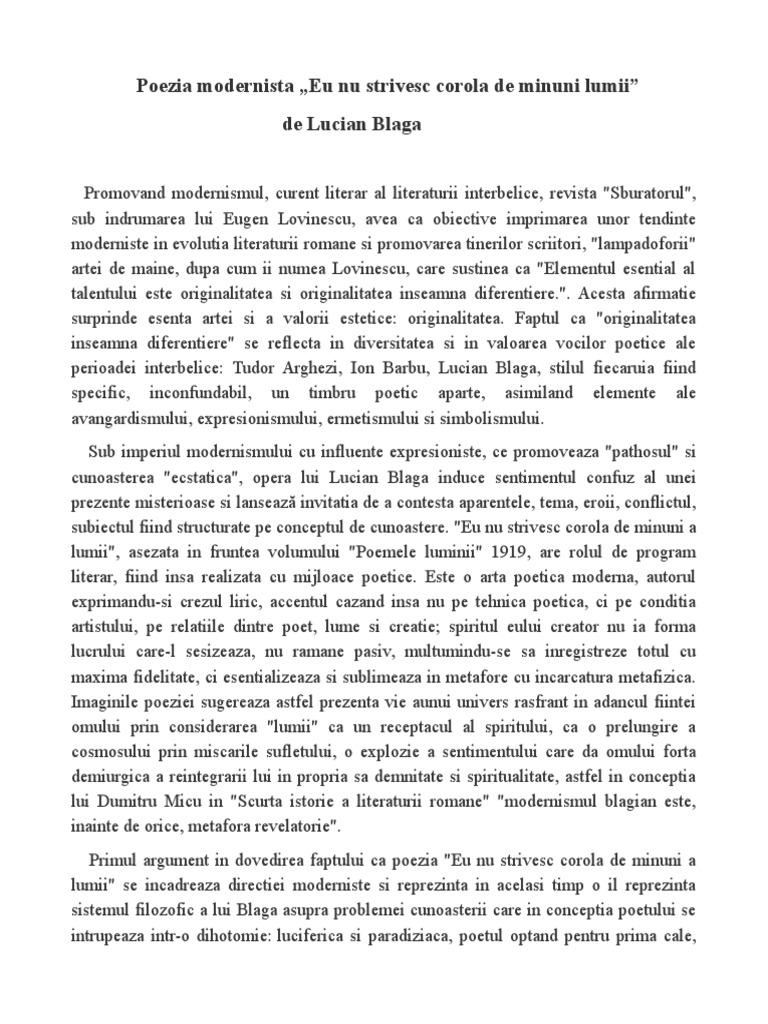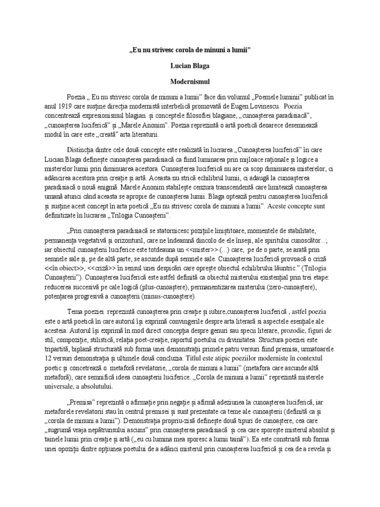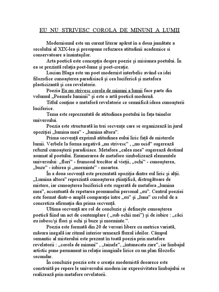 Eu nu strivesc corola de minuni a lumii modernism. Poezia eu nu strivesc corola de minuni a lumii de lucian blaga este o artă poetică modernă alături de testament de tudor arghezi şi joc secund de ion barbu. Dacă arghezi punea în centrul artei sale poetice problema limbajului şi a cuvintelor potrivite blaga accentuează raportul dintre poet şi. Apare evident că eu nu strivesc corola de minuni a lumii se constituie ca o artă poetică ca act de mărturisire a unui crez artistic si a unei conduite filozofice ceea ce explică şi orgolioasa ei aşezare în fruntea întregii creaţii poetice a lui l. De lucian blaga.