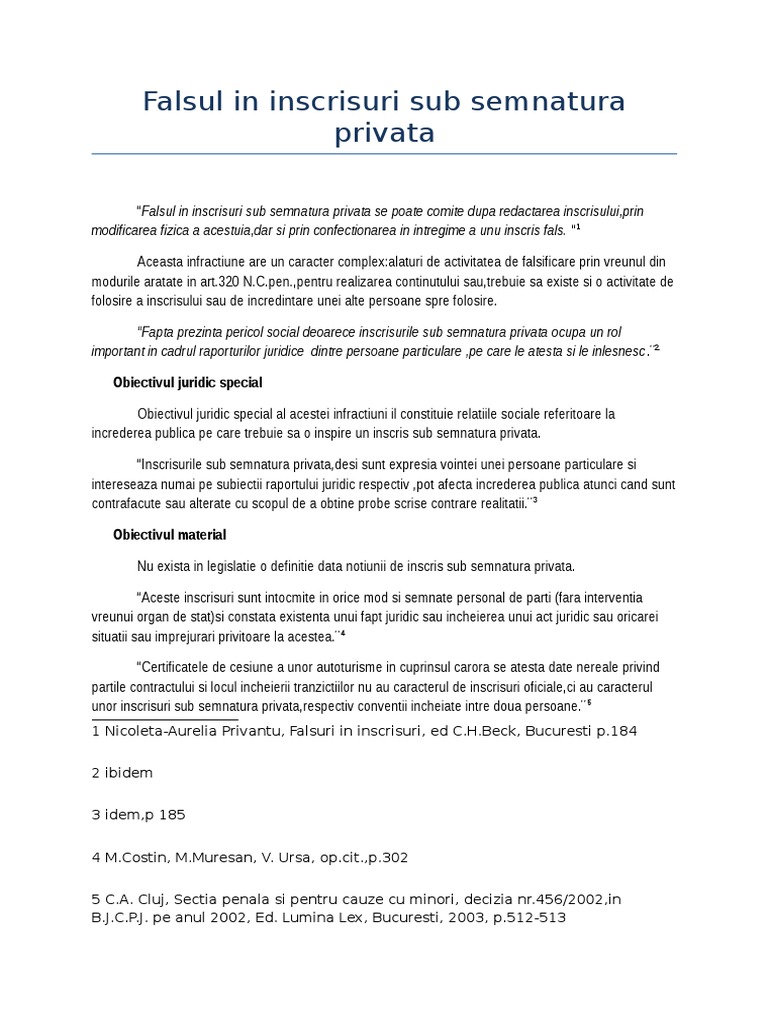 288 din acelaşi cod prin contrafacerea scrierii ori a subscrierii sau prin alterarea lui în orice mod dacă făptuitorul foloseşte înscrisul falsificat ori îl. Infracțiunea de fals în înscrisuri sub semnătură privată se consumă în momentul realizării acțiunii de denaturare a adevărului de falsificare folosire a înscrisului falsificat în măsura în care această acțiune este de natură să producă consecințe juridice. Pen falsificarea unui înscris sub semnătură privată prin vreunul din modurile arătate în art.