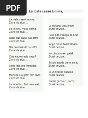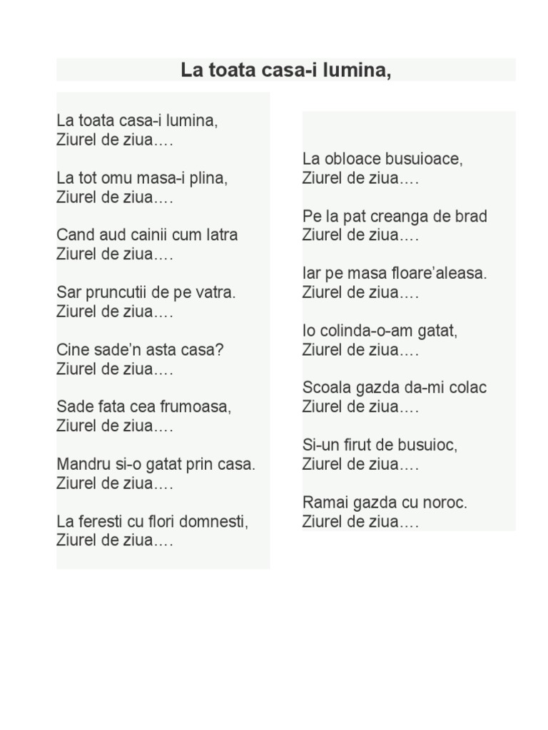 Noi umblăm și colindăm ziurel de ziuă pe dumnezeu lăudăm ziurel de ziuă. 160 la toată casă i lumină. Cine sede in asta casa ziurel de ziua sede o nevasta frumoasa ziurel de ziua. La feresti cu flori domnesti ziurel de ziua la obloace busuioace ziurel de ziua.