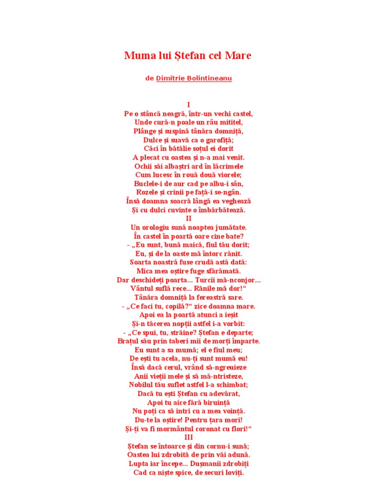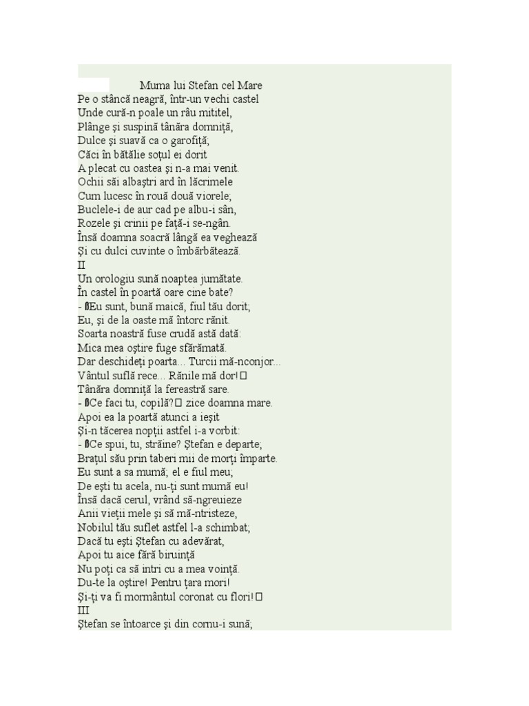 Mama lui stefan cel mare poezia. Mama lui stefan cel mare dimitrie bolintineanu pe o stanca neagra intr un vechi castel unde cura n vale un rau mititel plange si suspina tanara domnita dulce si suava ca o garofita caci in batalie sotul ei dorit a plecat cu oastea si n a mai venit. Muma lui ştefan cel mare dimitrie bolintineanu. Apoi ea la poartă atunci a ieșit și n tăcerea nopții astfel i a vorbit. Rezumat muma lui stefan cel mare pe o stanca unde curgea un mic raulet o frumoasa domnita statea si plangea caci sotul ei era in lupta soacra sa era langa ela si incerca s o imbarbateze.