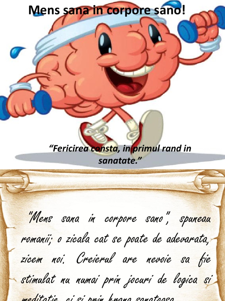 O minte sanatoasa intr un corp sanatos. Proiect minte sanatoasa in corp sanatos simona ciff. Elevii fiecărei clase a derulat câte un proiect uneori în parteneriat cu alte clase urmărind să crească starea de bine atât pentru sine cât și pentru grupul comunitatea din care face parte. Importanta sportului mens sana in corpore sano este un proverb latin care prin traducere inseamna minte sanatoasa in corp sanatos.