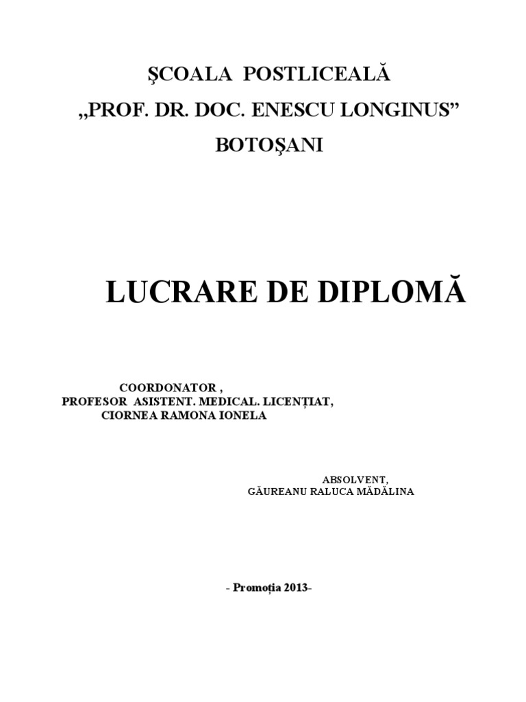 Lucrare de diploma asistent medical generalist ingrijirea pacientei cu prolaps genital scoala postliceala dimitrie cantemir tg mures specialitate. Asistent medical generalist lucrare medicina. Redactate de cadru medical. Contin o parte teoretica in care veti gasi descrierea aparatului sau a sistemului afectat descrierea afectiunii tehnici de ingrijire si o parte practica care cuprinde descrierea cazurilor clinice.