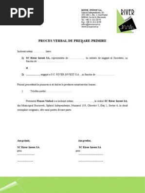 Model proces verbal de predare primire intre gestionari. Proces verbal de predare primire. Descarcati gratuit cea mai buna varianta de statute procuri contracte imputerniciri cereri decizii autorizatii coduri legi ordonante 2015. 11 1 2011 7 09 00 am company. 3 14 2013 11 02 00 am other titles.