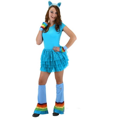 Rainbow dash tutu deluxe my little pony costume medium 7 8. Be the happiest pony around this halloween when you dress up in this officially licensed rainbow dash costume. The wide blue waistband with attached giant bow is too cute. This comfy stretch dress features a glitter print of rainbow dash s cutie mark on the front and has a voluminous rainbow tutu skirt and tulle sleeves that flutter as you fly.