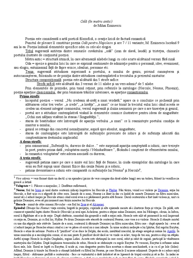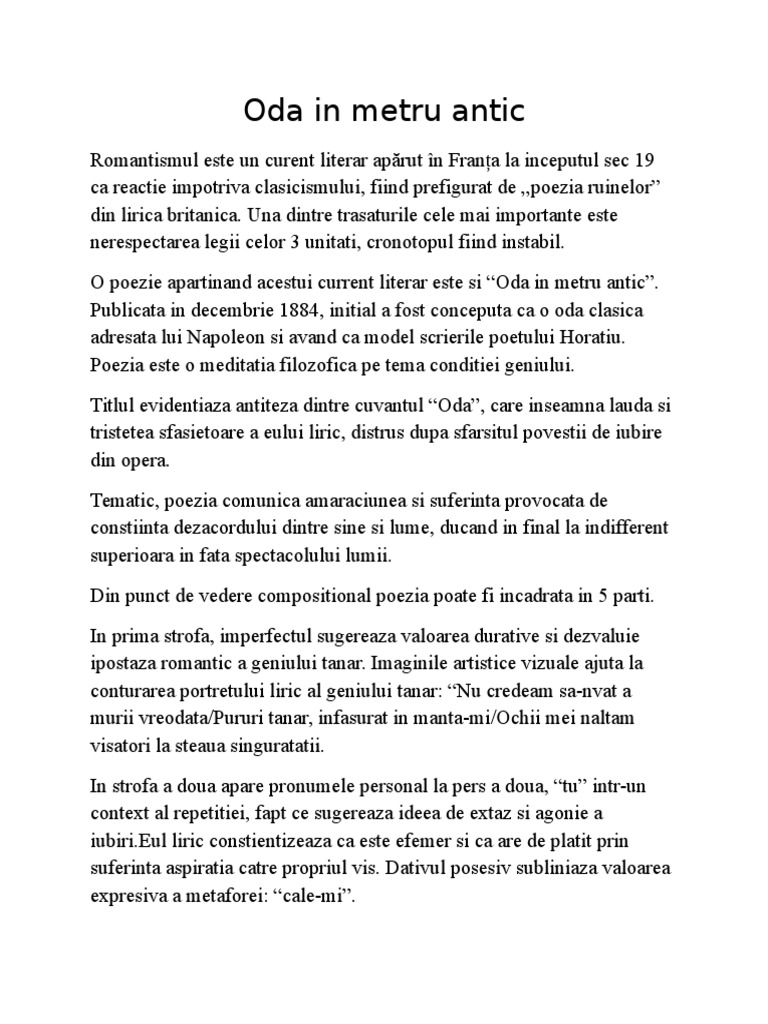 Oda in metru antic eseu. Metrul antic se intalneste in versurile lipsite de rima in care alterneaza silabe mai scurte cu silabe mai lungi in ideea cresterii sonoritatii poeziei. Voluptatea durerii sentimentul prefacerii vietii in vis poezia devenind o elegie de iubire. Odă în metru antic este o creație eminesciană de maturitate înglobând elemente ce aparțin unor varii specii literare. May 14 2019 at 10 49 pm deci bosilor fiyi antene ca aveti cateva greseli de typing si anume citez.