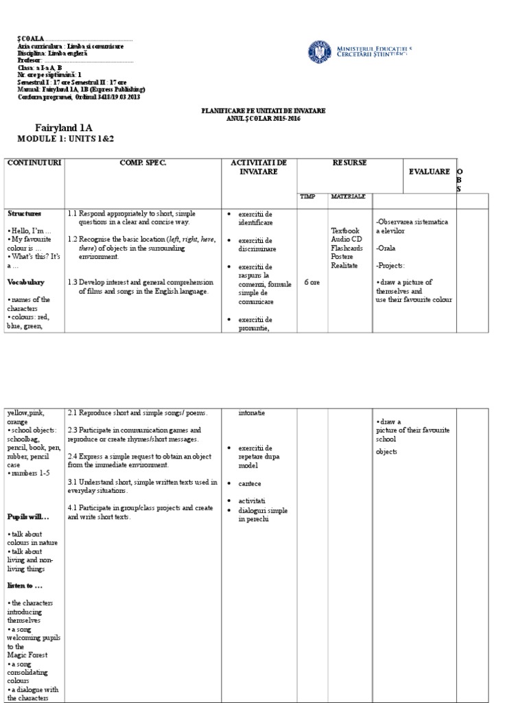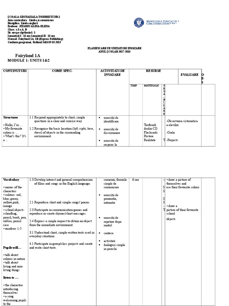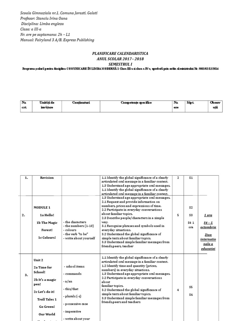 Planificare pe unitati fairyland 3. Planificare pe unități de învățare disciplina formarea abilităților de comunicare clasa 6 invatamant special elevi cu deficiențe severe. Planificare fairyland 4b semestrul ii. 100 1 100 au considerat acest document util 1 vot 377 vizualizări. Planificare pe unitati de invatare 2017 2018 industrie alimentară submitted by anca tache on 09 noi 2017 12 44.