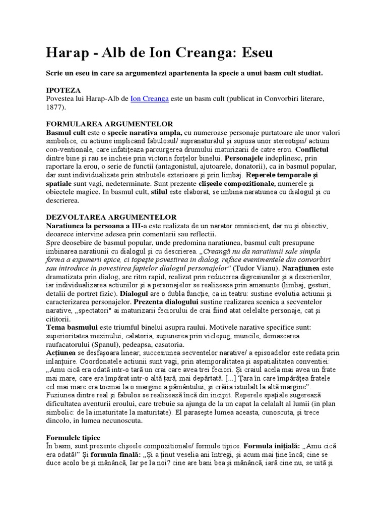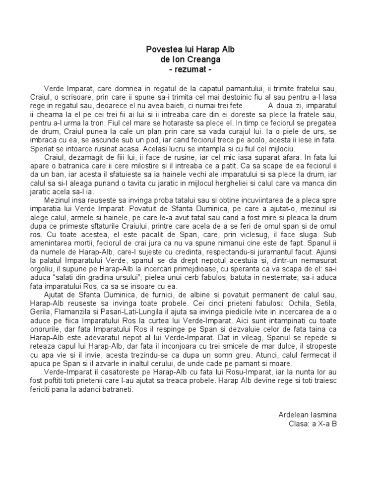 Binele și răul cu victoria celui dintâi de fapt o. Povestea lui harap alb de ion creangă specie. Basmul povestea lui harap alb a apărul la 1 august 1877 în revista junimistă convorbiri literare. 1 introducere povestea lui harap alb de ion creanga este o capodopera de inspiratie folclorica un basm cult apreciat de george calinescu pentru sinteza de realism de fabulos si umanism dar si o creatie reprezentativa pentr viziunea despre lume a marelui clasic al literaturii romane.