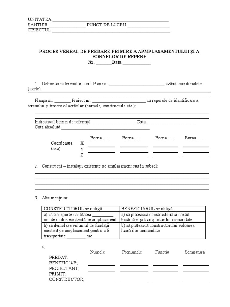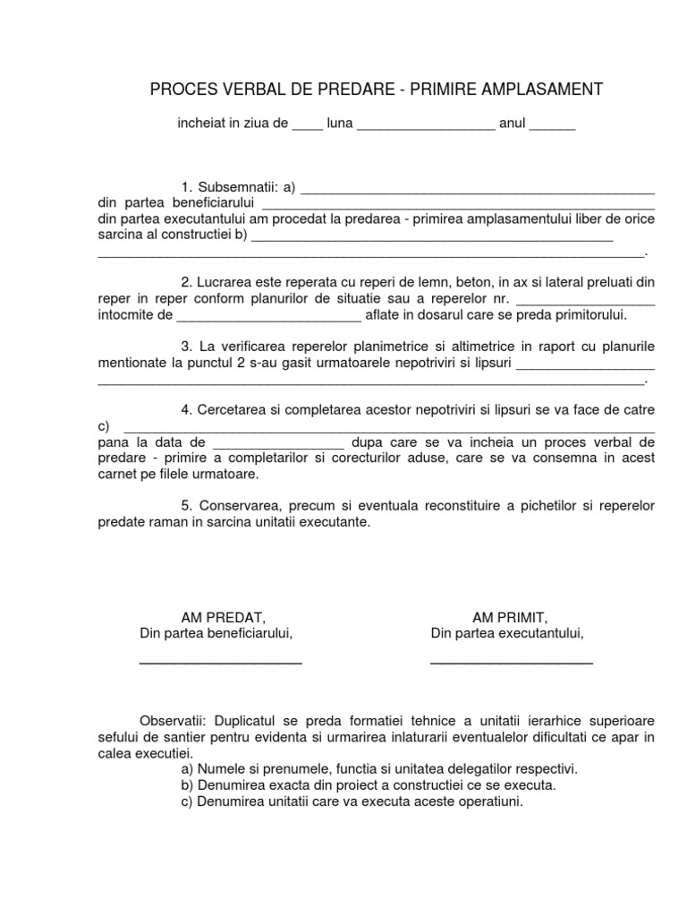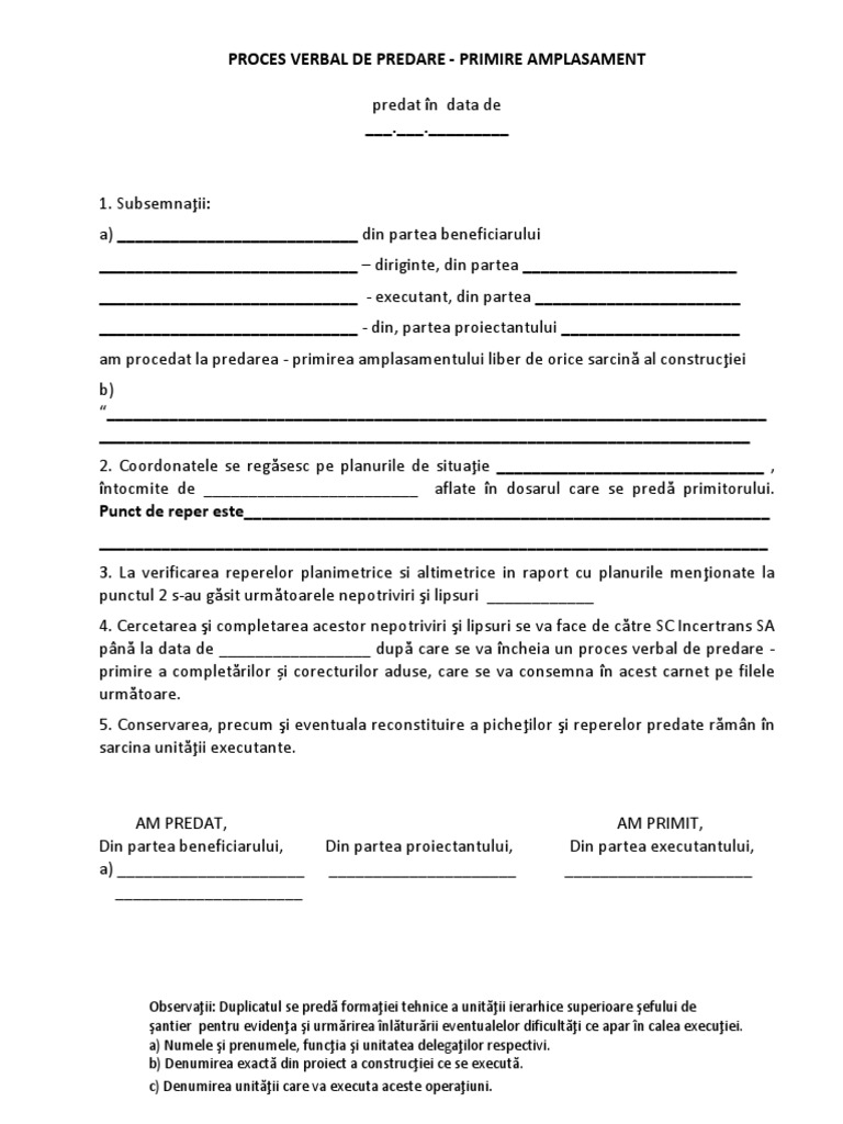Proces verbal predare primire amplasament completat. Conservarea precum si eventuala reconstituire a pichetilor si reperelor predate raman in sarcina unitatii executante. Formular online proces verbal predare primire amplasament. Pv faze determinante interna. Proces verbal de trasare a lucrarilor.