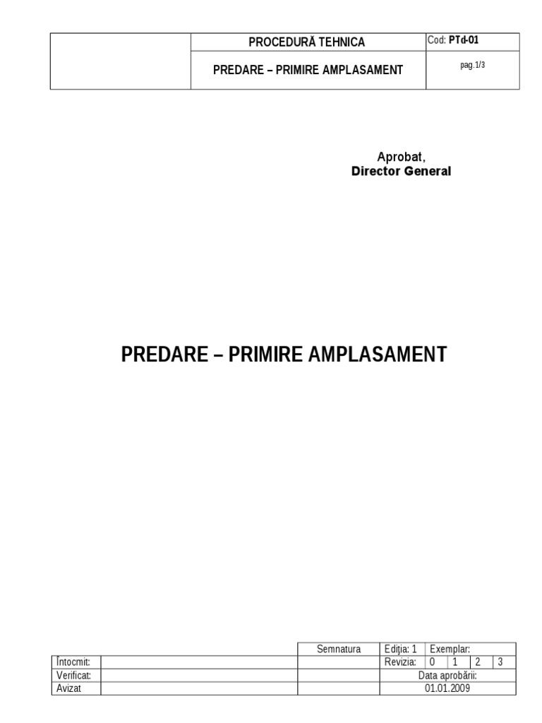 Proces verbal predare primire amplasament drumuri. Descarcati gratuit cea mai buna varianta de statute procuri contracte imputerniciri cereri decizii autorizatii coduri legi ordonante 2015. Prezentul process verbal de predare primire s a incheiat in 2 doua exemplare din care 1 unu pentru ocpi sibiu si unul pt am predat am primit ocpi sibiu. Descarcati gratuit cea mai buna varianta de statute procuri contracte imputerniciri cereri decizii autorizatii coduri legi ordonante 2015. Proces verbal de predare primire a amplasamentului ªi a.