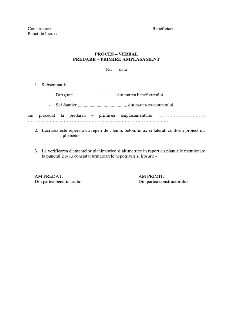 Cercetarea şi completarea acestor nepotriviri şi lipsuri se va face de către sc incertrans sa până la data de după care se va încheia un proces verbal de predare primire a completărilor și corecturilor aduse care se va consemna în acest carnet pe filele următoare. Proces verbal de natura teren fundare. Anexa 1 proces verbal de predare primire a amplasamentului si a bornelor de repere anexa 2 proces verbal de trasare a lucrarilor anexa 3 proces verbal de control al calitatii lucrarilor in faze determinante anexa 4 proces verbal pentru verificarea calitatii lucrarilor ce devin ascunse anexa 5 proces verbal de receptie calitativa. Download model de proces verbal de predare primire download formular model de proces verbal de predare primire in format pdf word doc.