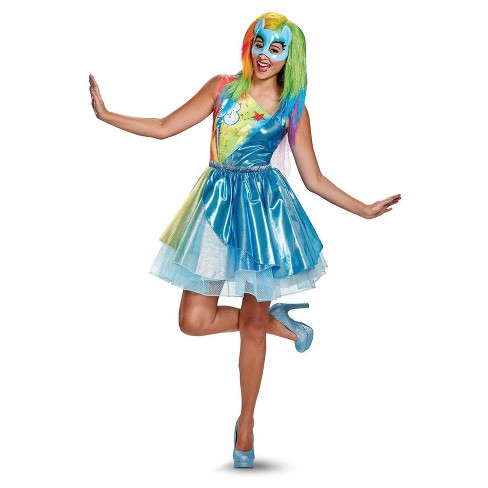 Adult my little pony my little pony. This comfy stretch dress features a glitter print of rainbow dash s cutie mark on the front and has a voluminous rainbow tutu skirt and tulle sleeves that flutter as you fly. Be the happiest pony around this halloween when you dress up in this officially licensed rainbow dash costume. But rainbow dash is a pony and you daughter is a human you say.