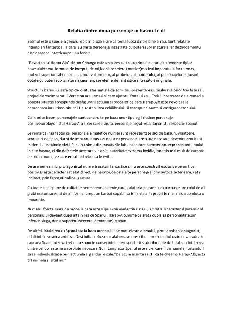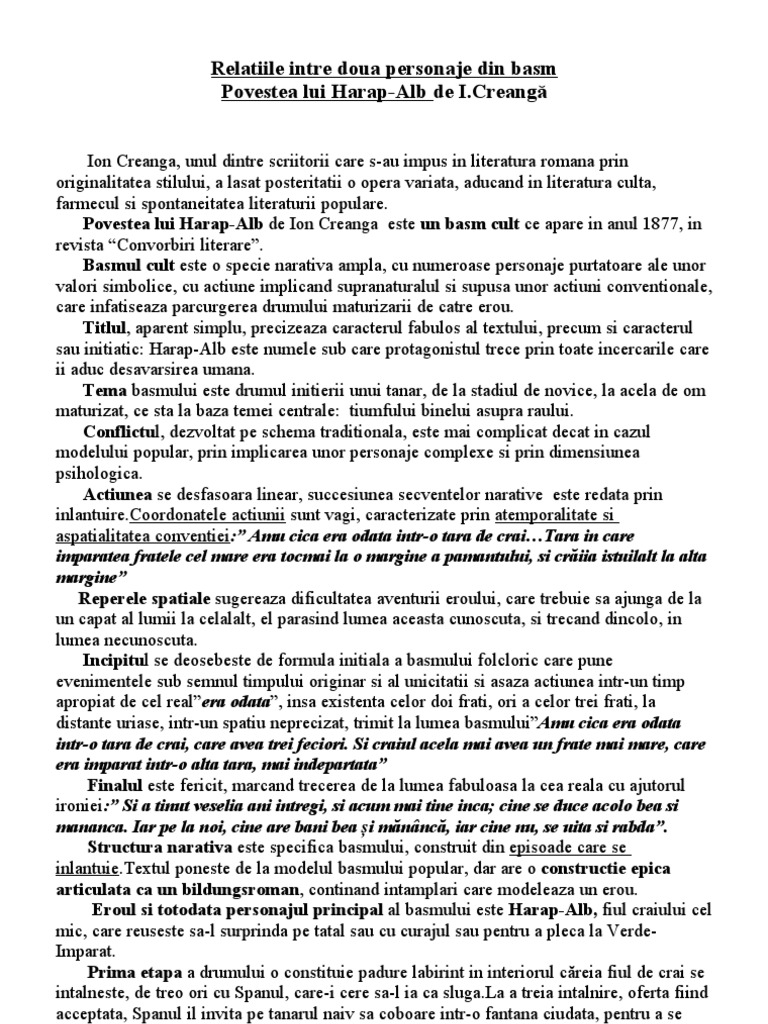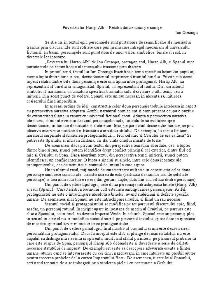 Relatia dintre 2 personaje harap alb. Relatiile intre doua personaje din basm povestea lui harap alb de i. Povestea lui harap alb de ion creangă este un basm cult publicat în anul 1877 în revista convorbiri literare reprezentativ pentru creația autorului și pentru evoluția ulterioară a prozei românești. Spânul personaj secundar antagonist negativ tipul omului viclean manipulator şi duplicitar reprezintă răul necesar fără de care nu ar fi fost posibilă iniţierea. Povestea lui harap alb relaţia dintre două personaje spânul harap alb basmul cult este o specie narativă amplă o naraţiune pluriepisodică cu numeroase personaje purtătoare ale unor valori simbolice.
