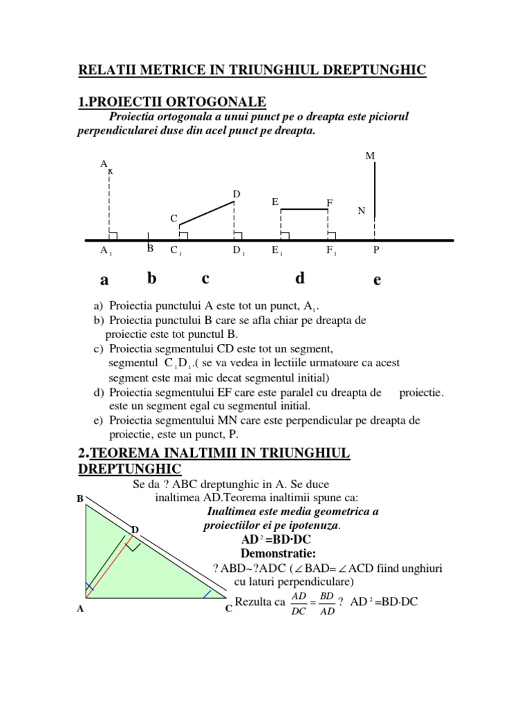 Relatii metrice in triunghiul dreptunghic. Fie δabc dreptunghic în a cu ad bc d bc. Relatii metrice in triunghiul dreptunghic 1 proiectii ortogonale proiecţia ortogonala a unui punct pe o dreapta este piciorul perpendicularei duse din acel punct pe dreapta. Acum aflam ac in triunghiul abc aplicam teorema lui pitagora. Proiectia ortogonala a unui segment pe o dreapta este un segment sau un punct.