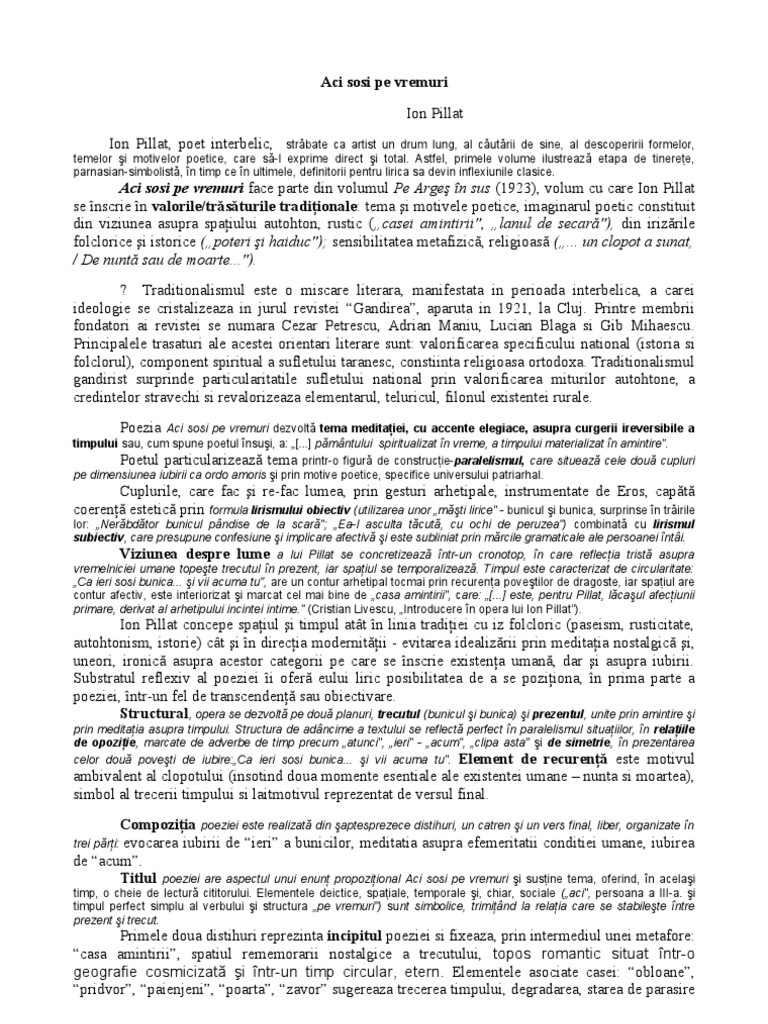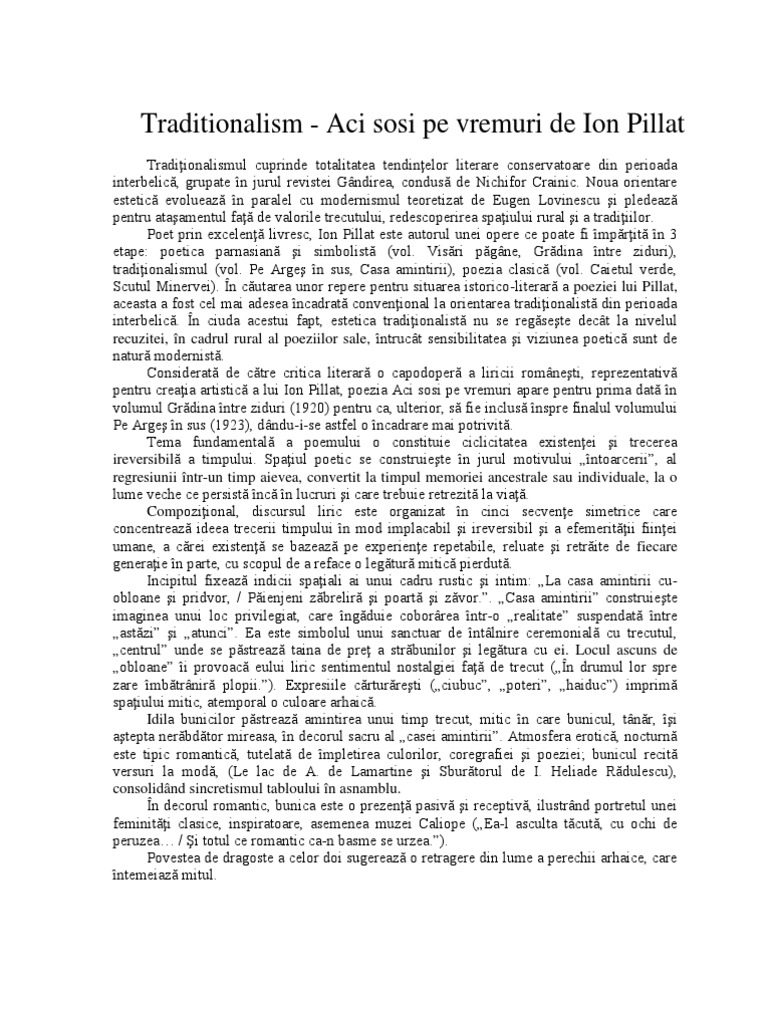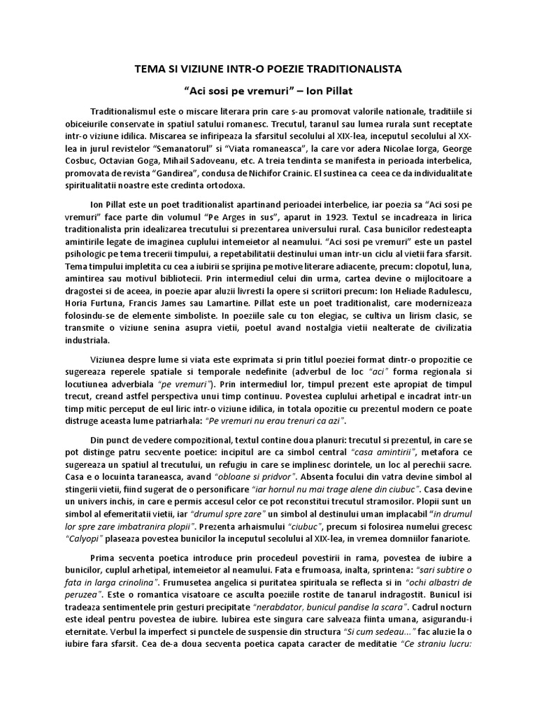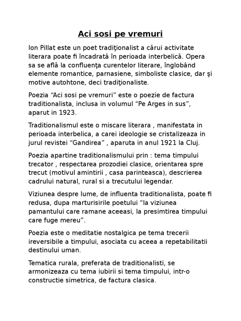 Tema si viziunea despre lume aci sosi pe vremuri. Tradiționalismul este o ideologie cultural literară caracterizată printr un ansamblu de credințe și concepte culturale cu reviste și personalități care au animat cultura românească atât înaintea primului război mondial cât și în perioada interbelică. Arge n sus aparut n perioada interbelic n 1923. Poetul reia vechile teme ale traditionalismului romanesc. Concluzie aci sosi pe vremuri de ion pillat aparţine li ricii tradiţionaliste prin idilizarea trecutului a ca drului rural dar şi prin tema timpului trecător fugit irrreparabile tempus.