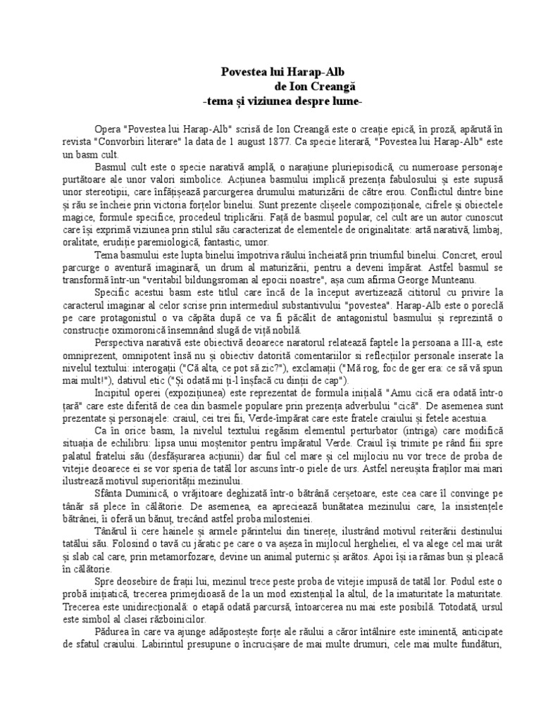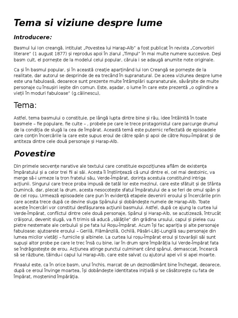 Tema si viziunea despre lume povestea lui harap alb. Exprimarea unui punct de vedere argumentat despre modul în care se reflecta viziunea despre lume în basmul cult pentru care ai optat. Tema și viziunea despre lume povestea lui harap alb ion creangă basmul a apărut ca o necesitate a impunerii unor idei și norme morale în comunitățile umane care își doreau să ducă existența și se conduceau în baza unor legi nescrise cât și ca modalitate de abstragere din cotidian într un ținut magic în care totul este permis iar abaterile de la norme sunt aspru.