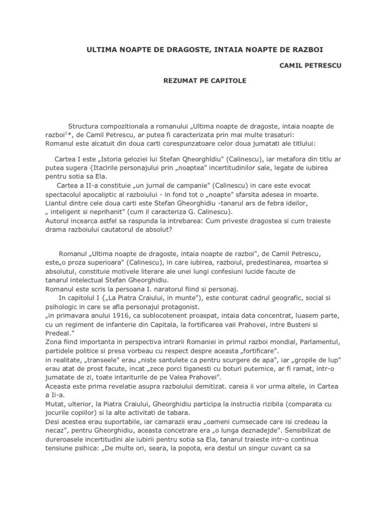 Rezumat pe capitole ultima noapte de dragosteintaia noapte de razboi mai jos o sa aveti mai multe rezultate pentru cautarea rezumat pe capitole ultima noapte de dragosteintaia noapte de razboi. Ultima noapte de dragoste întâia noapte de război este un roman scris de camil petrescu și publicat în 1930 autorul surprinde drama intelectualului lucid însetat de absolutul sentimentului de iubire dominat de incertitudini care se salvează prin conștientizarea unei drame mai puternice aceea a omenirii ce trăiește tragismul unui război absurd văzut ca iminență a morții. Poate că împreună hotărâseră chemarea mea de pe graniţă pentru actul de donaţie. Ultima noapte de dragoste r.